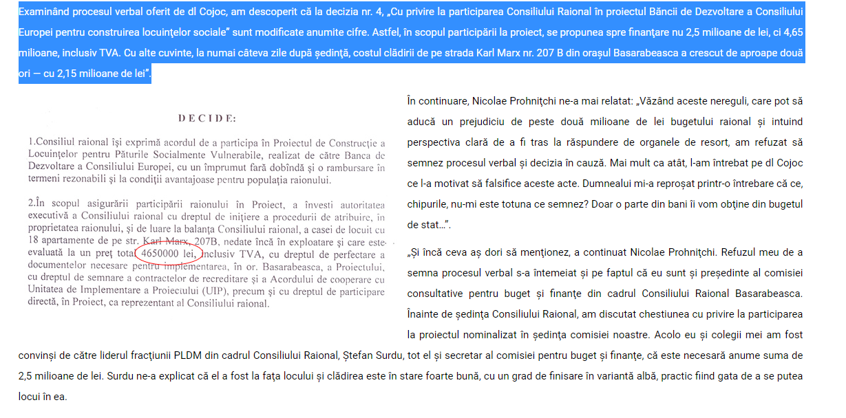 „Examinând procesul verbal oferit de dl Cojoc, am descoperit că la decizia nr. 4, „Cu privire la participarea Consiliului Raional în proiectul Băncii de Dezvoltare a Consiliului Europei pentru construirea locuinţelor sociale” sunt modificate anumite cifre. Astfel, în scopul participării la proiect, se propunea spre finanţare nu 2,5 milioane de lei, ci 4,65 milioane, inclusiv TVA. Cu alte cuvinte, la numai câteva zile după şedinţă, costul clădirii de pe strada Karl Marx nr. 207 B din oraşul Basarabeasca a crescut de aproape două ori — cu 2,15 milioane de lei”, a declarant Nicolae Prohnițchi.