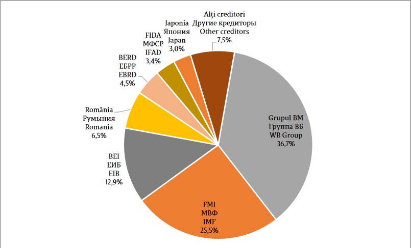 Ce ține de țări, aici Moldova are o notă de plată pentru România (datoria constituie 6,5 %) și Japonia (3 %). Iar 7,5 % din datoria externă a fost acumulată din alte surse de creditare.