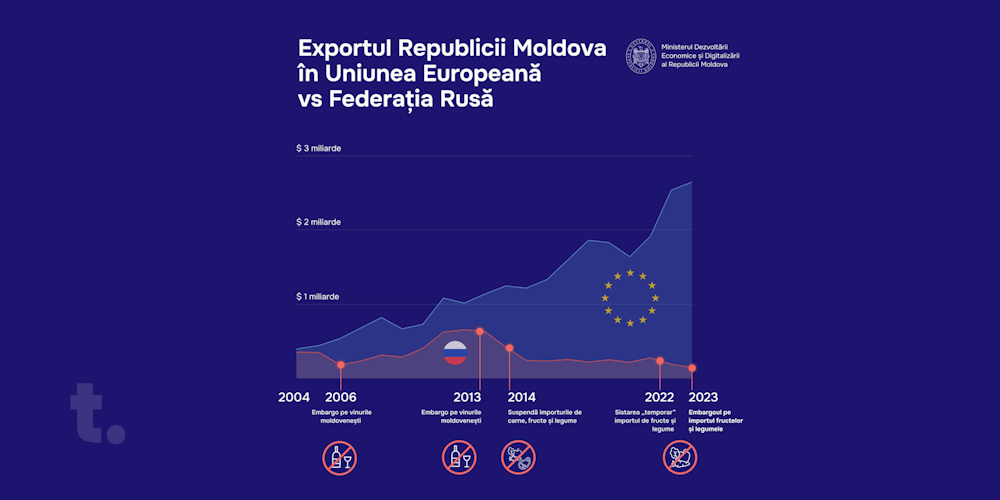Ministrul Dezvoltării și Digitalizării Economiei, Dumitru Alaiba, a publicat un mesaj în care subliniază contrastul evident dintre relațiile economice ale Republicii Moldova cu Uniunea Europeană și Rusia, folosind date concrete pentru a ilustra această diferență. Alaiba a evidențiat că, în timp ce Rusia a impus embargo-uri repetate de-a lungul anilor, Uniunea Europeană a oferit constant noi oportunități pentru exportatorii moldoveni, informează telegraph.md
