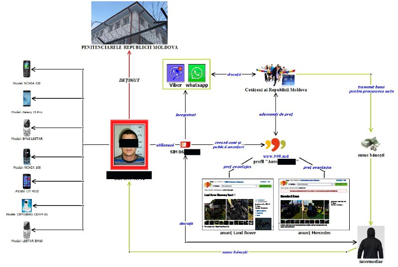 Potrivit materialelor dosarului, bănuiții își creau conturi pe paginile de internet de publicare a anunțurilor de vânzare, ulterior preluau imagini cu mașini de vânzare în statele din Europa și le propuneau spre vânzare în calitate de intermediari. În următoarea fază, aceștia le cereau clienților sume de bani în avans, între 1500 și 3000 euro; iar uneori pretindeau astfel de sume în mod repetat, astfel încât unii păgubași le-au oferit și până la 9000 euro. Faza finală a schemei consta în ștergea contului de pe pagina anunțurilor publicitare și renunțarea la numerele de telefon folosite. Pentru realizarea schemei, în calitate de curieri ai sumelor de bani erau convinse ca să le acorde „asistență” persoane din afara penitenciarelor.