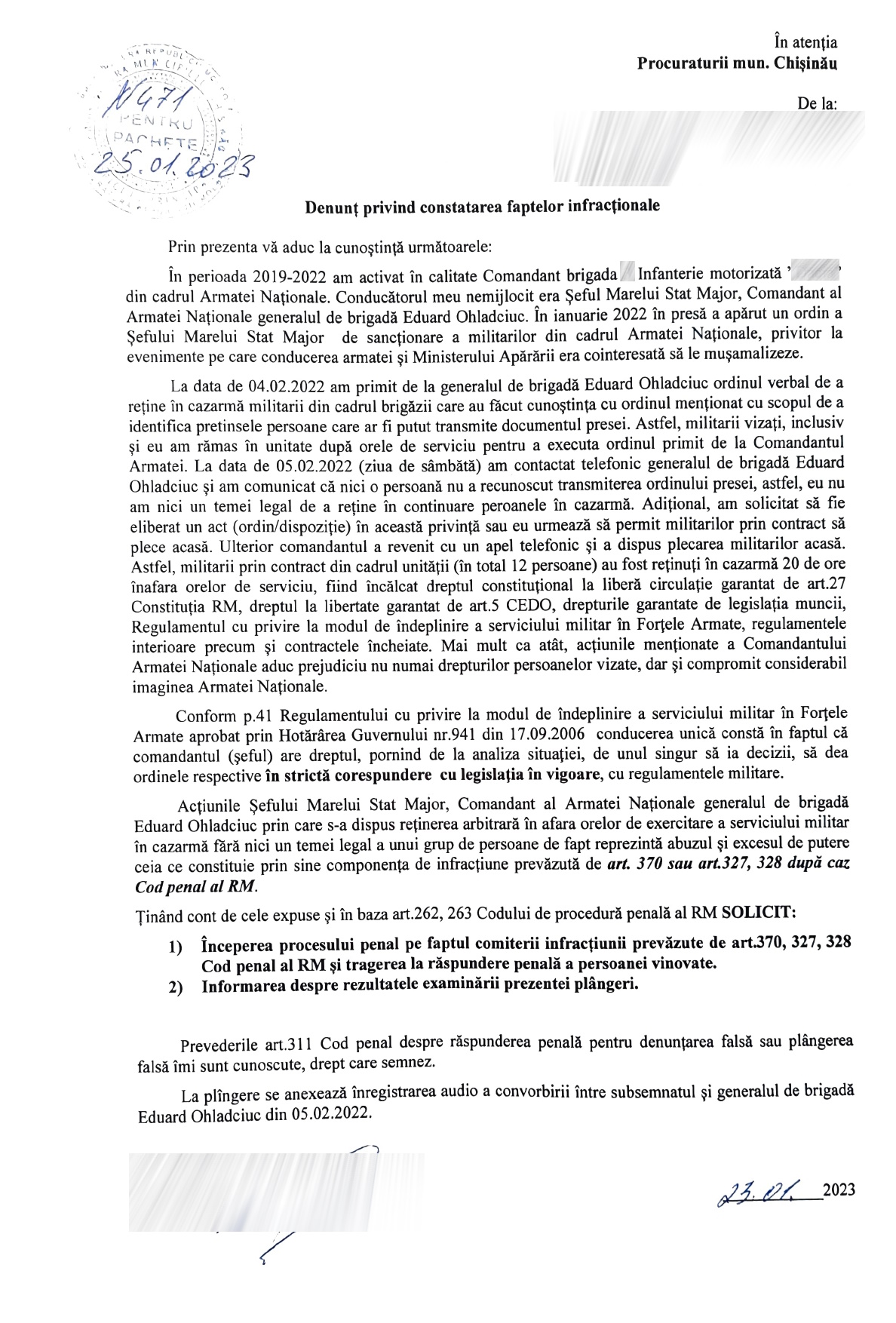 ”La data de 04.02.2022, am primit de la generalul de brigadă Eduard Ohladciuc ordinul verbal de a reține în cazarmă militarii din cadrul brigăzii care au făcut cunoștință cu ordinul menționat, cu scopul de a identifica pretinsele persoane care ar fi putut trimite documentul presei. Astfel, militarii vizați, inclusiv și eu am rămas în unitate după orele de serviciu pentru a executa ordinul primit de la Comandantul Armatei. la data de 05.02.2022 (ziua de sâmbătă) am contactat telefonic generalul de brigadă Eduard Ohladciuc și am comunicat, că nici o persoană nu a recunoscut transmiterea ordinului presei, astfel, eu nu am nici un temei legal de a reține în continuare persoanele în cazarmă. Adițional, am solicitat să fie eliberat un act (ordin/dispoziție) în această privință sau eu urmează să le permit militarilor prin contract să plece acasă. Ulterior, comandantul a revenit cu un apel telefonic și a dispus plecarea militarilor acasă. Astfel, militarii prin contract din cadrul unității (în total 12 persoane) au fost reținuți în cazarmă 20 de ore în afara orelor de serviciu, fiind încălcat dreptul constituțional la liberă circulație, dreptul la libertate și alte drepturi garantate de legislația muncii, regulamente ale Armatei Naționale”, a indicat denunțătorul, subliniind că acțiunile lui Ohladciuc compromit imaginea Armatei Naționale.