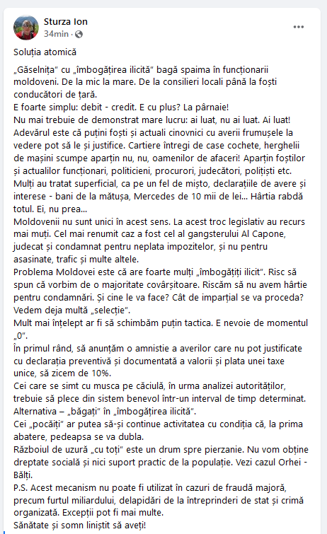 ”Vedem deja multă „selecție”. Mult mai înțelept ar fi să schimbăm puțin tactica. E nevoie de momentul „0”. În primul rând, să anunțăm o amnistie a averilor care nu pot justificate cu declarația preventivă și documentată a valorii și plata unei taxe unice, să zicem de 10%. Cei care se simt cu musca pe căciulă, în urma analizei autorităților, trebuie să plece din sistem benevol într-un interval de timp determinat. Alternativa – „băgați” în „îmbogățirea ilicită”. Cei „pocăiți” ar putea să-și continue activitatea cu condiția că, la prima abatere, pedeapsa se va dubla. Războiul de uzură „cu toți” este un drum spre pierzanie. Nu vom obține dreptate socială și nici suport practic de la populație. Vezi cazul Orhei – Bălți”, a scris Sturza.