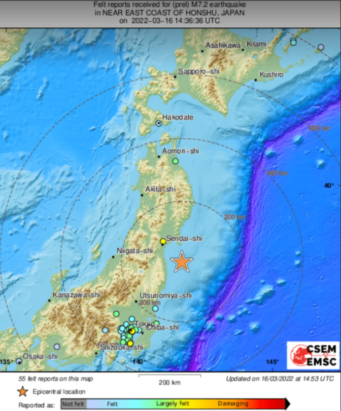 Două cutremure au lovit Japonia astăzi, 16 martie. Conform autorităților locale, primul ar fi avut o magnitudine de 6 grade pe scara Richter, iar al doilea a fost de 7,2 grade, informează TV8.md