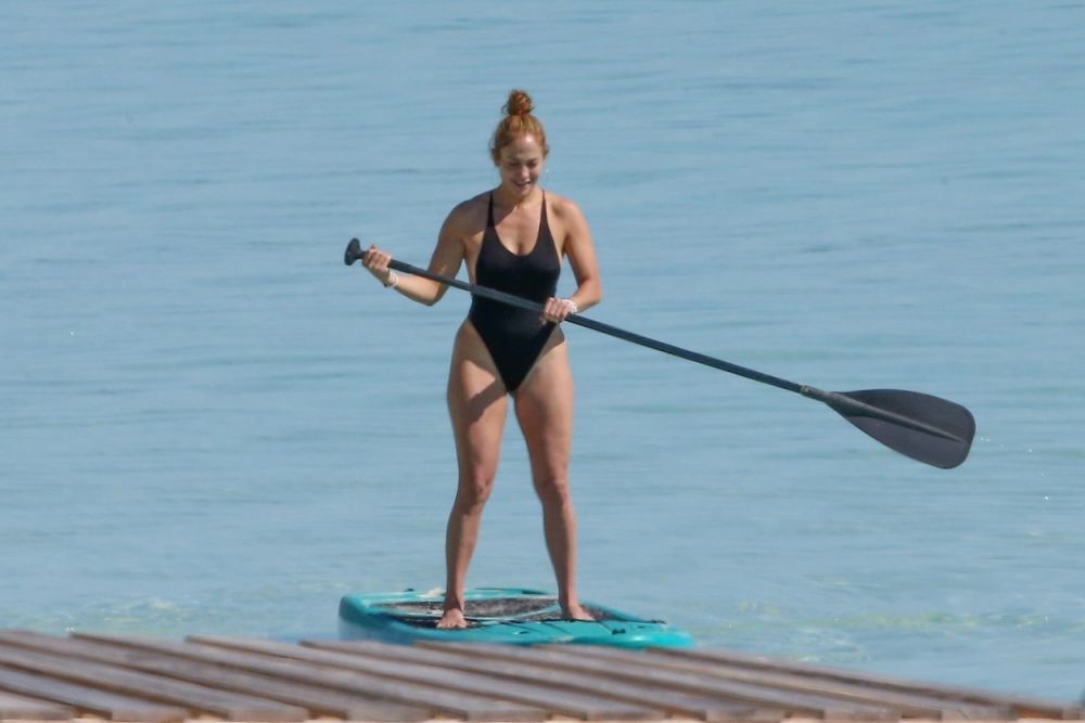 Artista de 51 de ani a fost fotografiată din toate unghiurile în timp ce încerca să facă paddleboarding. Renumită pentru corpul său lucrat la sala de fitness, Jennifer Lopez și-a etalat la soare faimosul posterior și picioarele musculoase, grație unui costum de baie în stil brazilian.