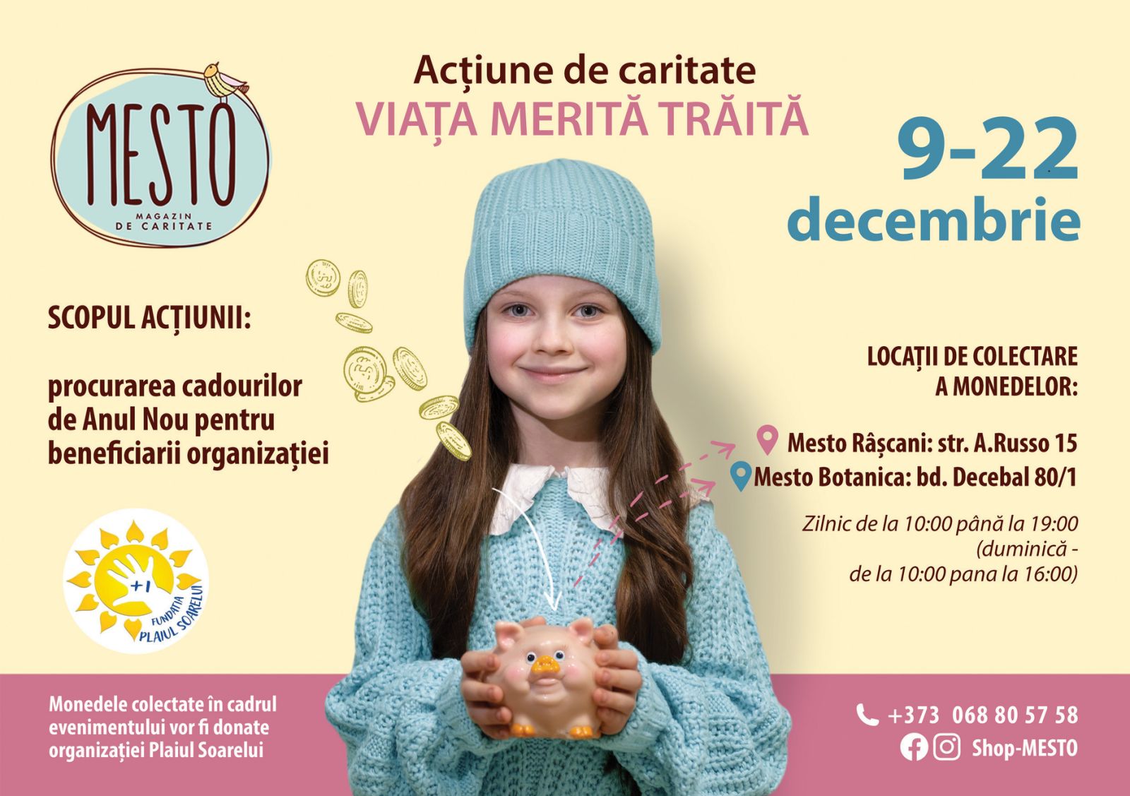 Inga Bostan, conducătoarea proiectului ,,MESTO”: „Viața merită trăită” este cel mai preferat eveniment a proiectului MESTO: este disponibil pentru toată lumea, indiferent de vârstă, statut și venit. Toți cei care pot împărți cel puțin o monedă devin parte din această magie. În cadrul celor patru ediții anterioare ale acestui eveniment caritabil, am strâns mai mult de 340 de mii de lei. Asta ne-a permis să îndeplinim cele mai profunde dorințe ale copiilor bolnavi de cancer sau din familii defavorizate, precum și să cumpărăm o casă rurală pentru o familie cu o mamă şi trei copii. Anul acesta ne propunem să aducem bucurie nu numai copiilor, ci și adulților cu nevoi speciale. Suntem încrezători că putem aduce zâmbete și împărtăși căldură și cu acești oameni”.