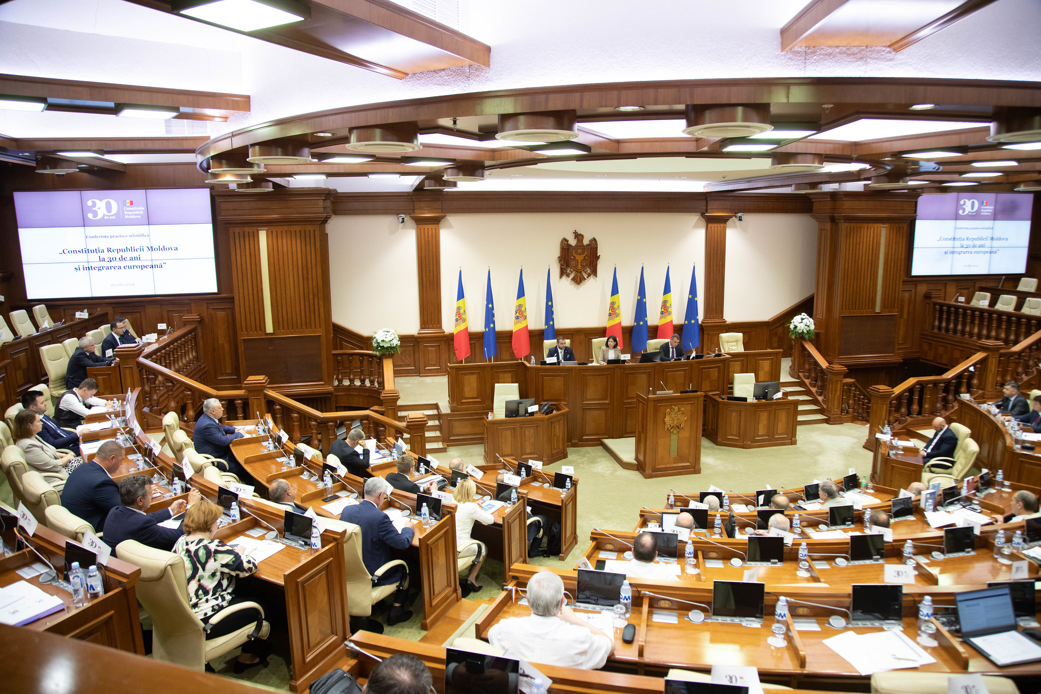 Parlamentul a organizat, astăzi, conferința aniversară practico-științifică cu genericul „Constituția Republicii Moldova la 30 de ani și integrarea europeană”. Evenimentul a reunit deputați din Parlamentul Republicii Moldova, foști deputați, membri ai Senatului României, judecători ai Curții Constituționale, reprezentanți ai instituțiilor statului, ai mediului academic, precum și funcționari din cadrul Secretariatului Parlamentului.