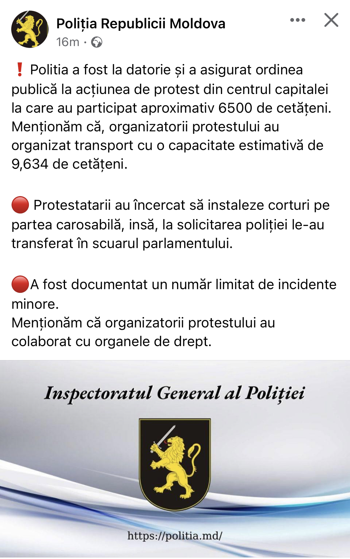 Poliția a fost la datorie și a asigurat ordinea publică la acțiunea de protest din centrul capitalei la care au participat aproximativ 6500 de cetățeni. Potrivit IGP, transportul planificat pentru astăzi a fost pentru minim 9634 persoane, dar nu precizează de ce celelalte aproximativ 3500 persoane nu au mai ajuns în PMAN.
