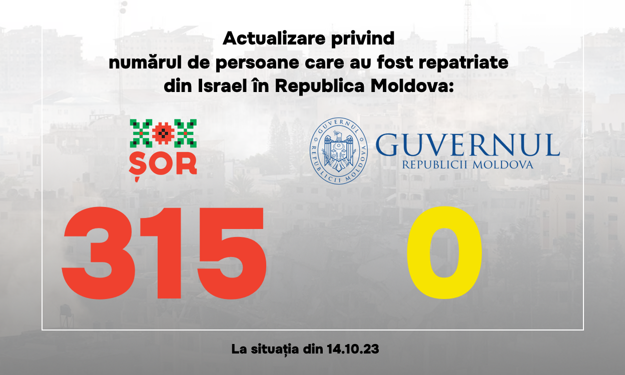 La situația din 14 octombrie 2023, zi în care locuitorii din Chișinău sărbătoreau în stradă Ziua oralului, Ilan Șor a reușit să repatrieze în țară 315 de persoane aflate în zonele de conflict din Israel, acolo unde are loc un război deschis. Pe de altă parte, Guvernul Republicii Moldova a confirmat pentru telegraph.md că cele 121 de persoane raportate ieri au ajuns pe curse regulate, respectiv pe cheltuiala lor și fără vreun suport bugetar din partea statului.