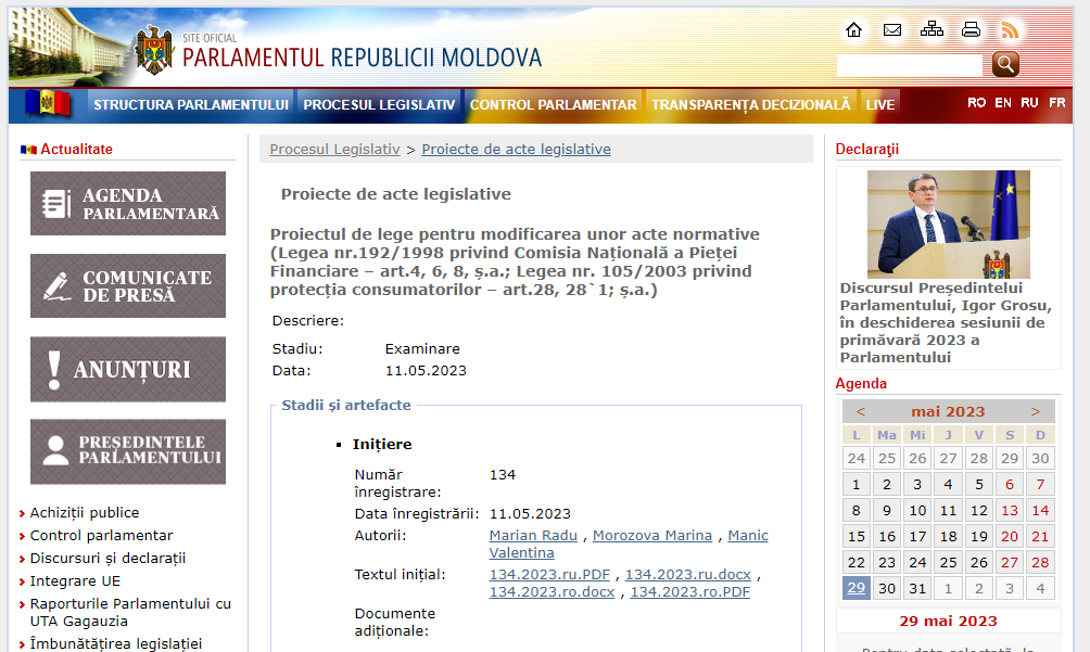 În cadrul ședinței din 26 mai 2023, Parlamentul a aprobat în prima lectură proiectul de lege, care prevede pretinsa ajustare a cadrului normativ la noul mandat al Comisiei Naționale a Pieței Financiare (CNPF). Necesitatea modificărilor legislative a fost determinată de redistribuirea unor competențe între CNPF și Banca Națională a Moldovei, începând cu 1 iulie anul curent, susțin autorii legii.