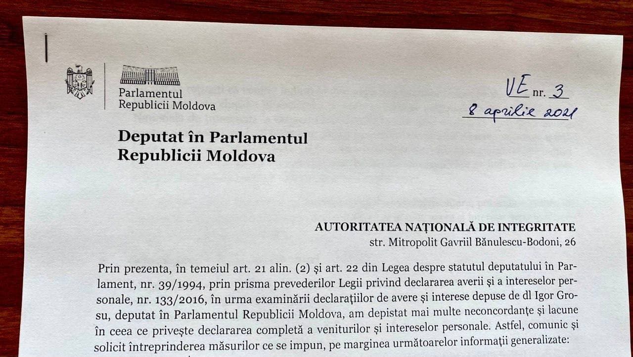 „În declarațiile anuale depuse la ANI pentru perioada 2018-2020 de către Igor Grosu, lipsește indicarea unui venit de două sute treizeci și șapte mii opt sute douăzeci și cinci lei 22 bani (237 825,22 lei), obținut printr-o hotărâre executorie a instanței de judecată. Suma dată, obținută de către soția lui Grosu, a figurat în declarația candidatului în funcția de deputat în Parlament depusă la Comisia Electorală Centrală pentru perioada cuprinsă în anii 2017-2018”, susține Evtodiev.