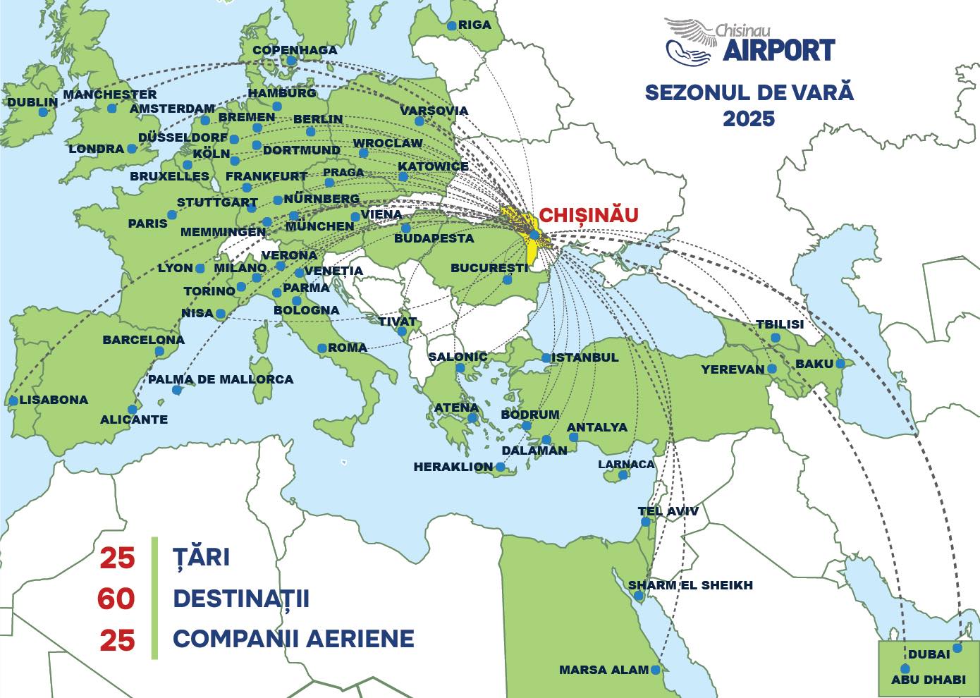 Sezonul de vară 2025 a început oficial pe Aeroportul Internațional Chișinău, iar pasagerii au la dispoziție curse regulate și charter către 60 de destinații din Europa, Orientul Mijlociu și Africa de Nord, operate de 23 de companii aeriene.