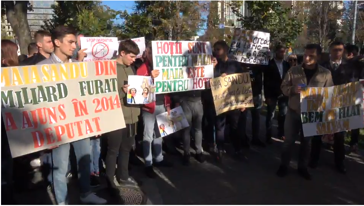 Tinerii au venit cu pancarte pe care scrie ”Maia și Andrei, cum e să fii finanțat de la Șorhei?”, ”Maia Sandu, din banii BEM pe Filat salvăm”. Pe alte pancarte se făcea aluzia despre zborul Maiei Sandu și a lui Vlad Filat spre Doha, cu avionul privat al lui Ilan Șor – ”Maia Sandu, cum e zborul la Doha cu avionul lui Șor?, ”Hoții sunt pentru Maia, Maia este pentru hoți”.