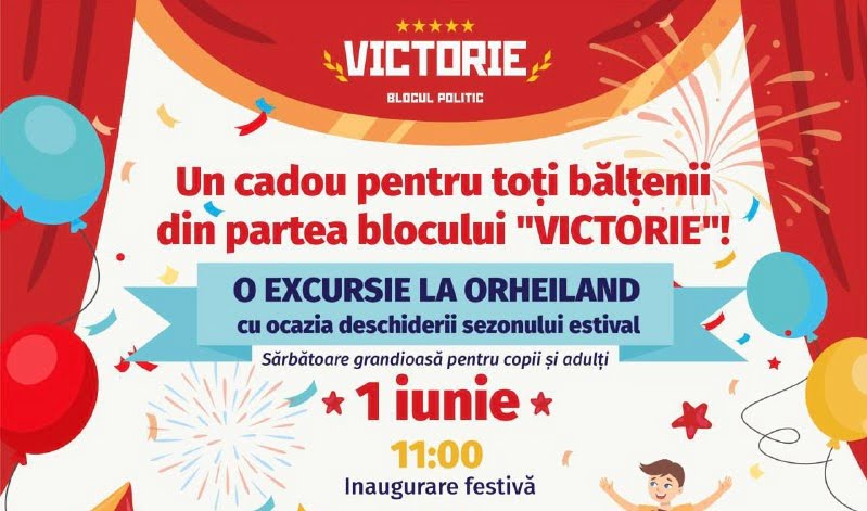 Blocul politic „Victorie” a pregătit două surprize pentru locuitorii Bălțiului, cu ocazia Zilei orașului care s-a desfășurat pe 22 mai. Atunci, echipa lui Ilan Șor a promis că va oferi un cadou și s-a ținut de cuvânt – toți locuitorii capitalei nordului sunt invitați să participe la deschiderea solemnă a sezonului estival în parcul de distracții OrheiLand.