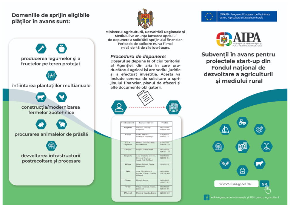Astfel, în perioada 15 aprilie – 18 iunie curent, tinerii și femeile fermieri, inclusiv, conaționalii reveniți acasă, care intenționează să lanseze afaceri în domeniul agriculturii, pot depune cereri pentru a solicita plăți în avans în vederea utilării și renovării tehnologice a fermelor zootehnice; procurării animalelor de prăsilă și menținerii fondului genetic al acestora; dezvoltării infrastructurii post-recoltare și procesare; producerii legumelor și a fructelor pe teren protejat (serii, solarii, tuneluri); înființării, modernizării și defrișării plantațiilor multianuale.