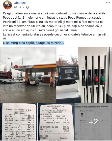 ”Dragi prieteni am ajuns și eu să mă confrunt cu minciunile de la stațiile Peco , astăzi 21 noiembrie am întrat la stație Peco Rompetrol strada Petricani 32, am făcut plinul cu motorină și mare mi-a fost mirarea ca într-un rezervor de 50 litri au încăput 64 l și vă dați bine seama că la stație eu nu am ajuns cu rezervorul gol uscat…”