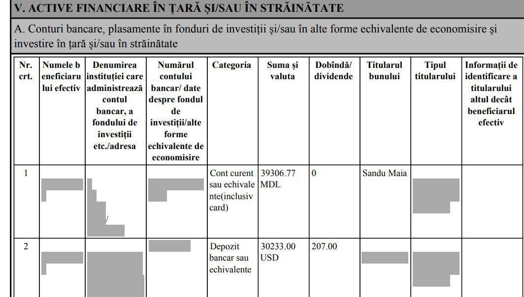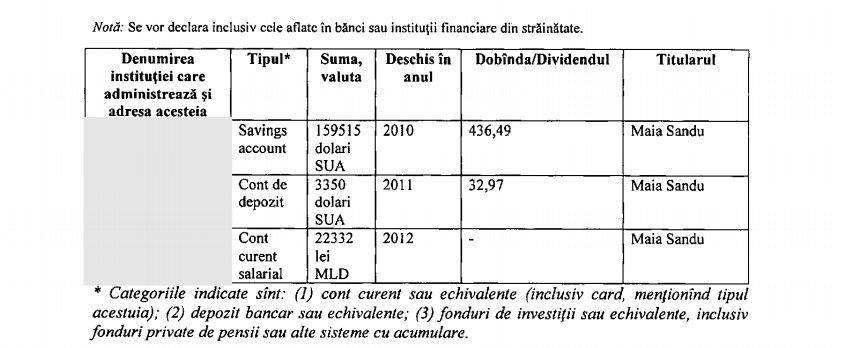 Pe parcursul anilor, suma depusă pe contul din 2010 se deminua cu câtva zeci de mii de dolari. Astfel, potrivit declarației din 2019, pe contul saving account au mai rămas doar 30 233.00 dolari.