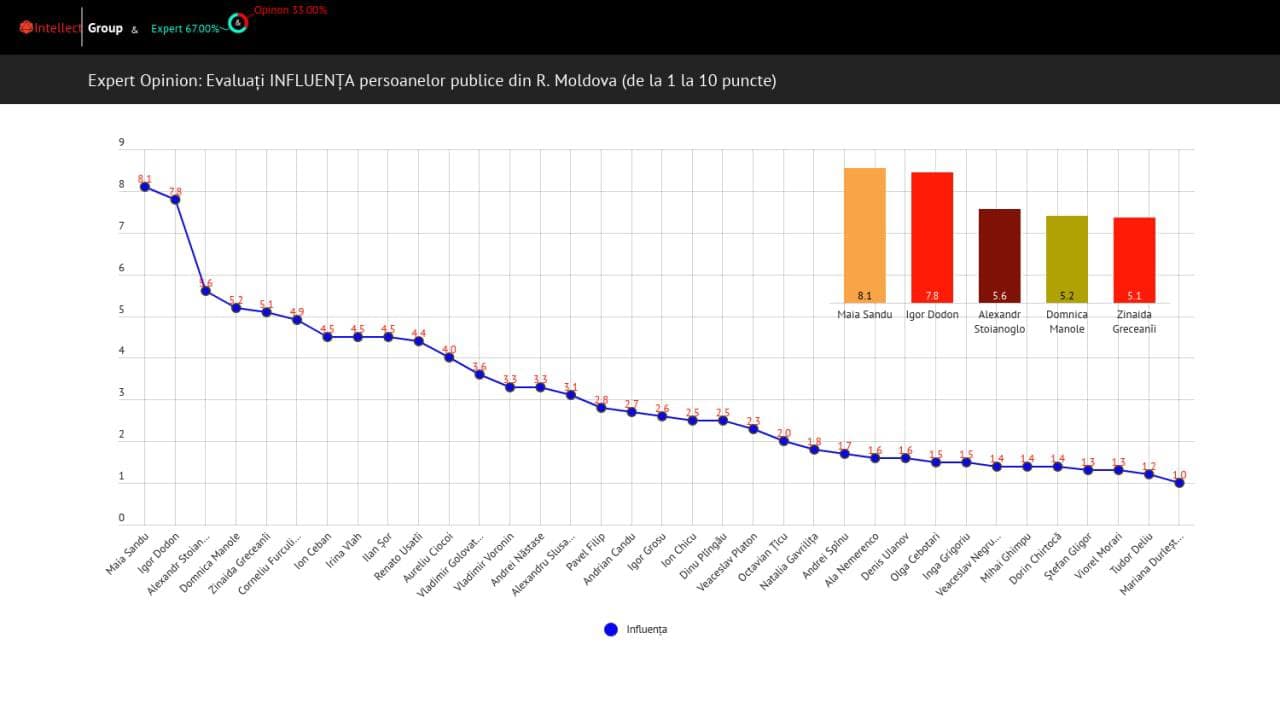 Experții care au participat la sondaj i-au plasat aproape la egalitate în topul persoanelor publice pe actual șef al statului și președintele PSRM. Maia Sandu a fost cotată cu 7,5 puncte și Igor Dodon – cu 7,4 puncte. În clasament urmează președintele Parlamentului, Zinaida Greceanîi (5,8), Procurorul General, Alexandr Stoianoglo (5,7), primarul general al Capitalei, Ion Ceban (5,5) și liderul fracțiunii parlamentare PSRM, Corneliu Furculiță (5,0 puncte).