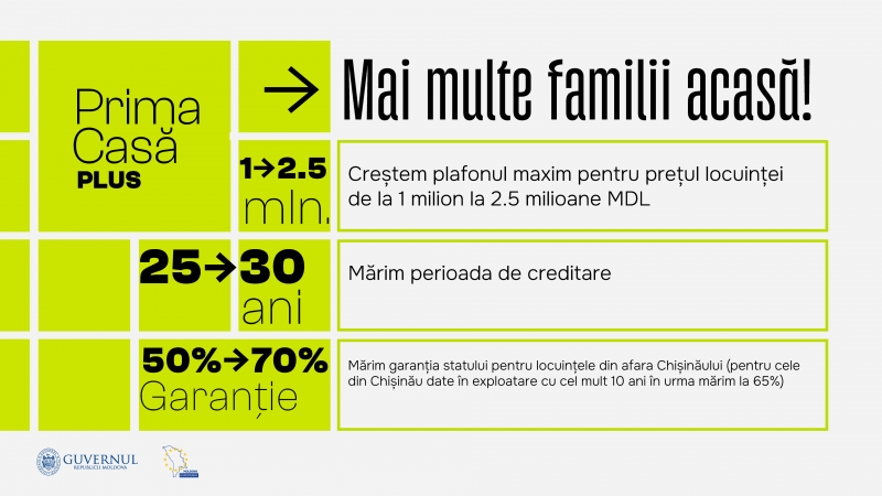 Astfel, executivul a majorat suma limită a creditului: de la 1 milion la 2,5 milioane de lei și cota de garantare de către stat de la 50% la 70% pentru locuințele din afara Chișinăului și de la 50% la 65% pentru locuințele din Chișinău date în exploatare cu maximum 10 ani înainte de participare.