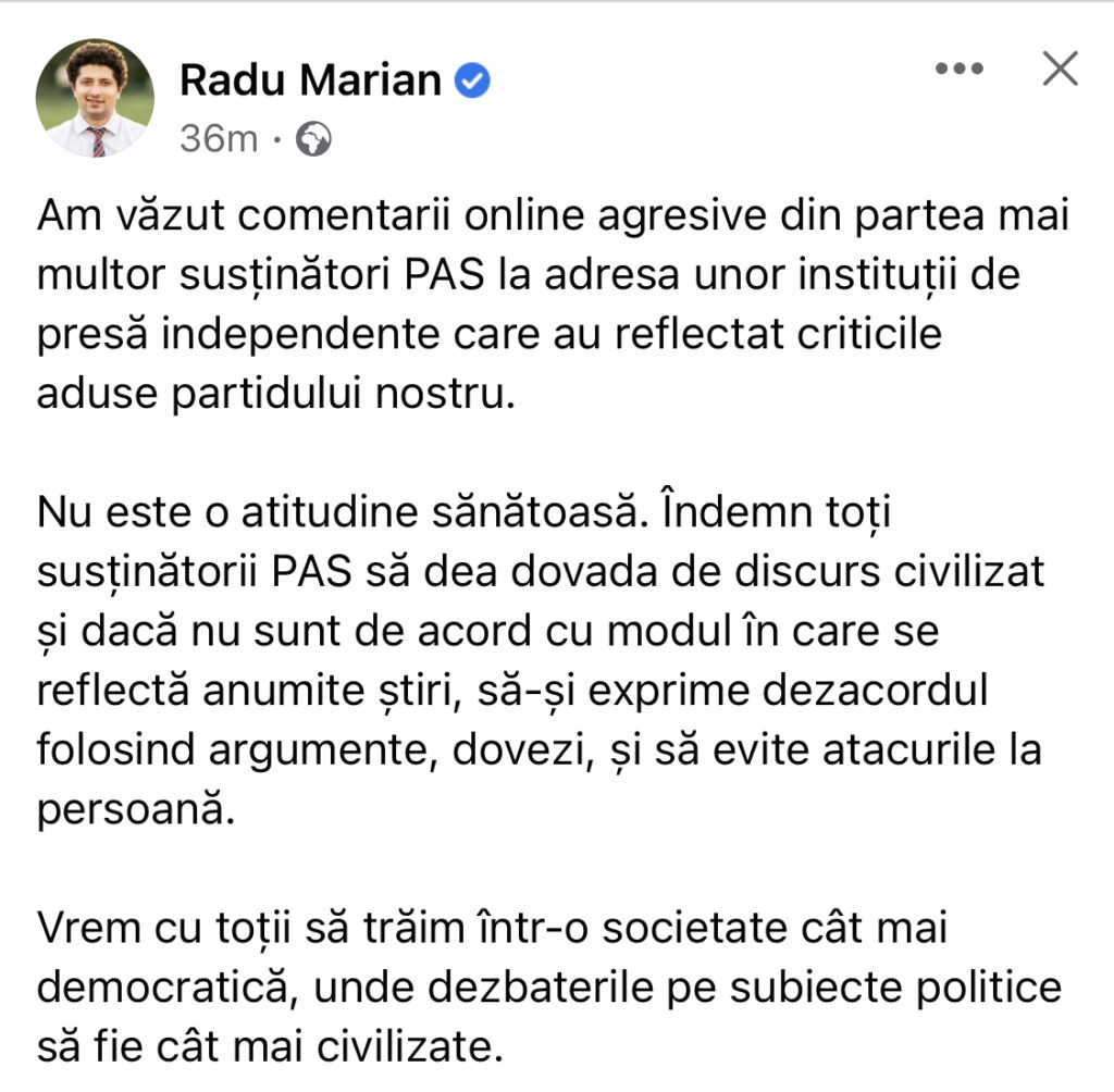“Am văzut comentarii online agresive din partea mai multor susținători PAS la adresa unor instituții de presă independente care au reflectat criticile aduse partidului nostru.