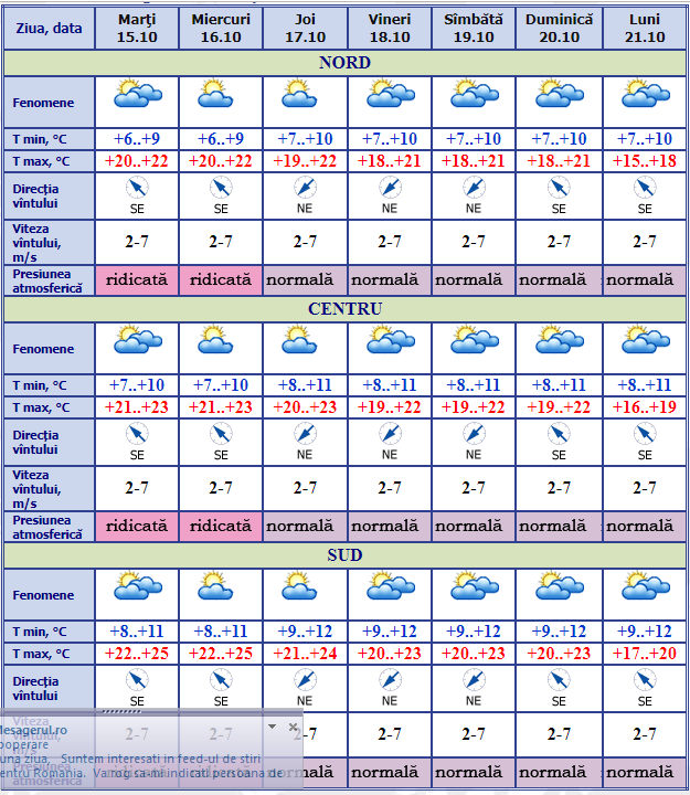 Așa cum am spus, astăzi vremea va fi foarte frumoasă: de toamnă caldă, însorită și prietenoasă. Maximele vor fi la nord de +20.. +21 de grade Celsius, la centru de +22 .. +23 de grade Celsius și ce +24.. +25 de grade Celsius.