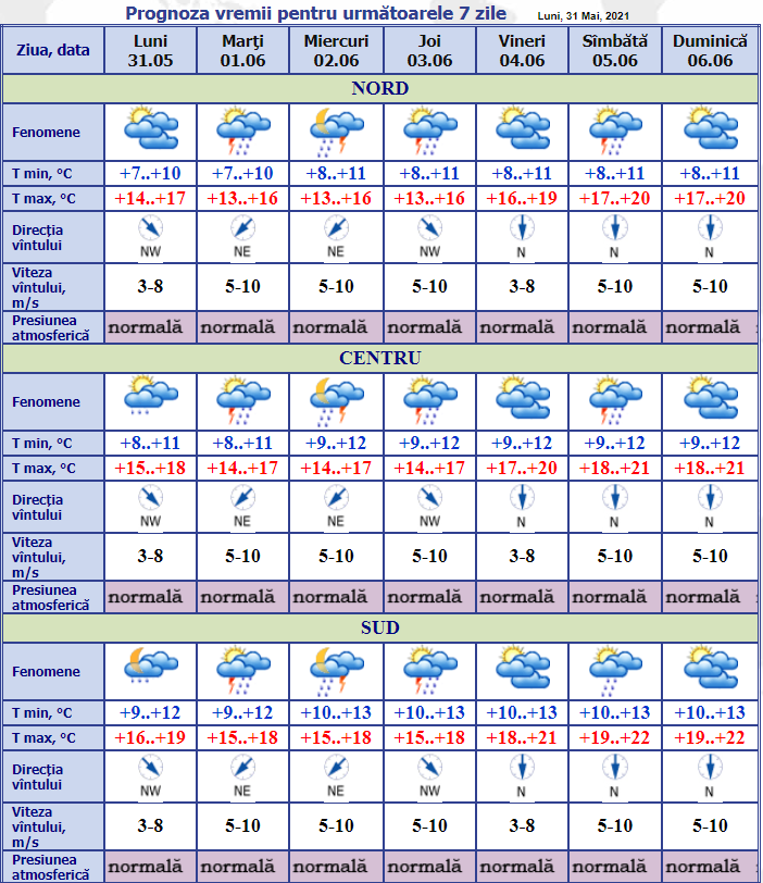 Astăzi, 31 mai, ziua se vor înregistra maxime cuprinse între +14… +19 grade Celsius. Noapte sunt așteptate minime cuprinse între +7… +12 grade Celsius.