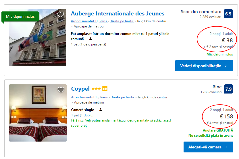 Potrivit booking.com, cazările decente în Paris încep de la 38€/2 nopți, iar pentru un hotel de 3*, fără mic dejun, prețurile încep de la 158€/2 nopți. Evident, pentru hotelurile de 4-5* sunt și prețuri ce depășesc 400€/două nopți.