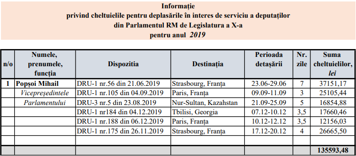 Potrivit raportului oficial al Parlamentului, anul trecut, în doar 10 luni de mandat, Popșoi a fost de patru ori în Franța și câte o singură dată în Georgia și Kazahstan.