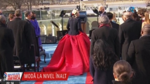 Supervedeta pop Lady Gaga, celebră pentru ținutele sale nonconformiste, a surprins din nou. A apărut cu o uriașă fustă fucsia și cu un top negru împodobit cu un porumbel mare din aur. Ea a interpretat imnul SUA la ceremonia de depunere a jurământului.