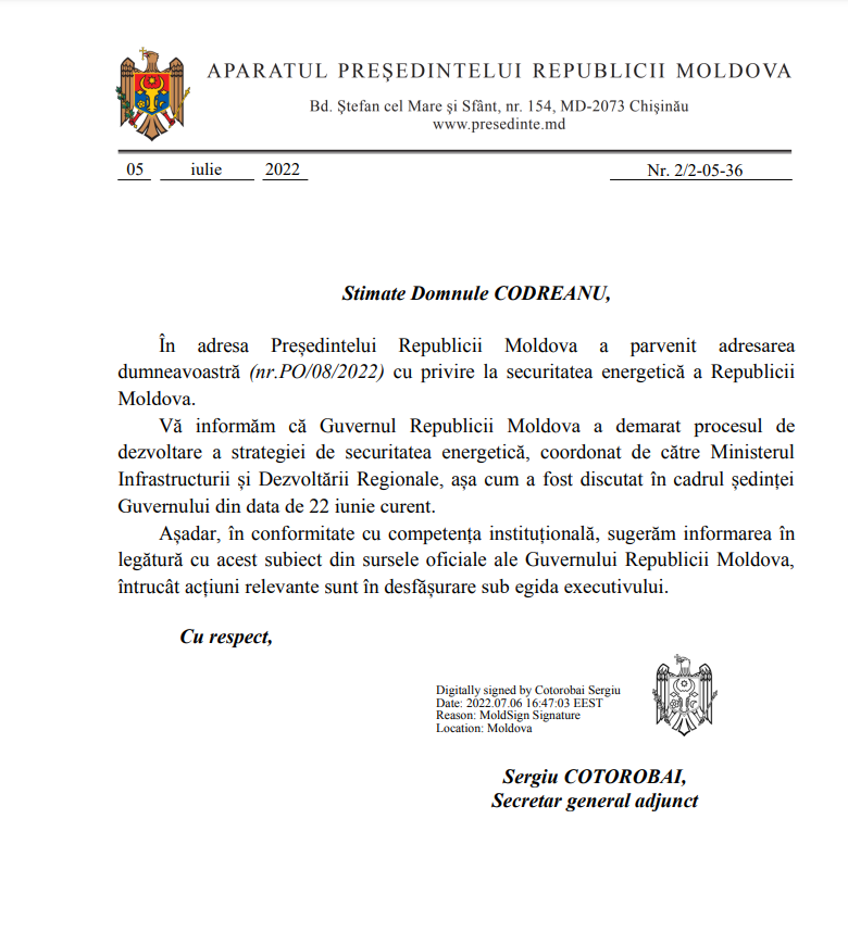 Amintim că la 22 iunie curent, Partidul Puterea Oamenilor a expediat o scrisoare în adresa Maiei Sandu, în care au cerut prezentarea unei viziuni și a unor acțiuni clare din partea guvernării în ceea ce privește securitatea energetică a țării. Noua scrisoare este formulată în urma răspunsului neclar și ignorant din partea instituției responsabile.