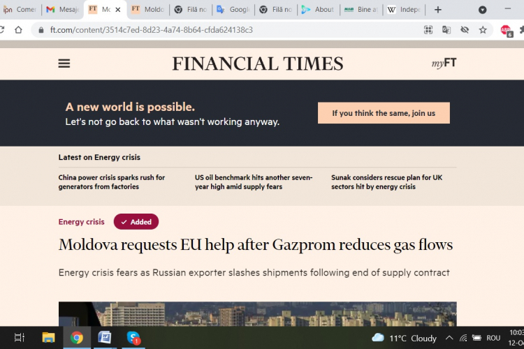 „Moldova solicită ajutorul UE după ce Gazpromul reduce livrările de gaze”, titrează Financial Times, cea mai respectabilă publicație de jurnalism financiar și analize economice din lume, notează IPN.