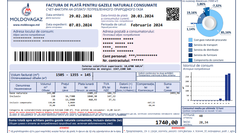 SA „Moldovagaz” anunță că noile tarife la gazele naturale, intrate în vigoare pe 23 februarie 2024, se vor aplica diferențiat pentru luna februarie, în funcție de data la care au fost citite contoarele.