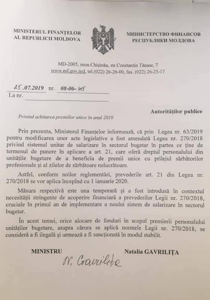 Moldoveanca stabilită în orașul german Hamburg, Minodora Prisacu, a venit cu un mesaj critic la adresa ministrei Finanțelor, Natalia Gavriliță, care a anunțat recent că Guvernul Sandu va interzice plata premiilor bănești pentru bugetari începând cu 01.01.2020.