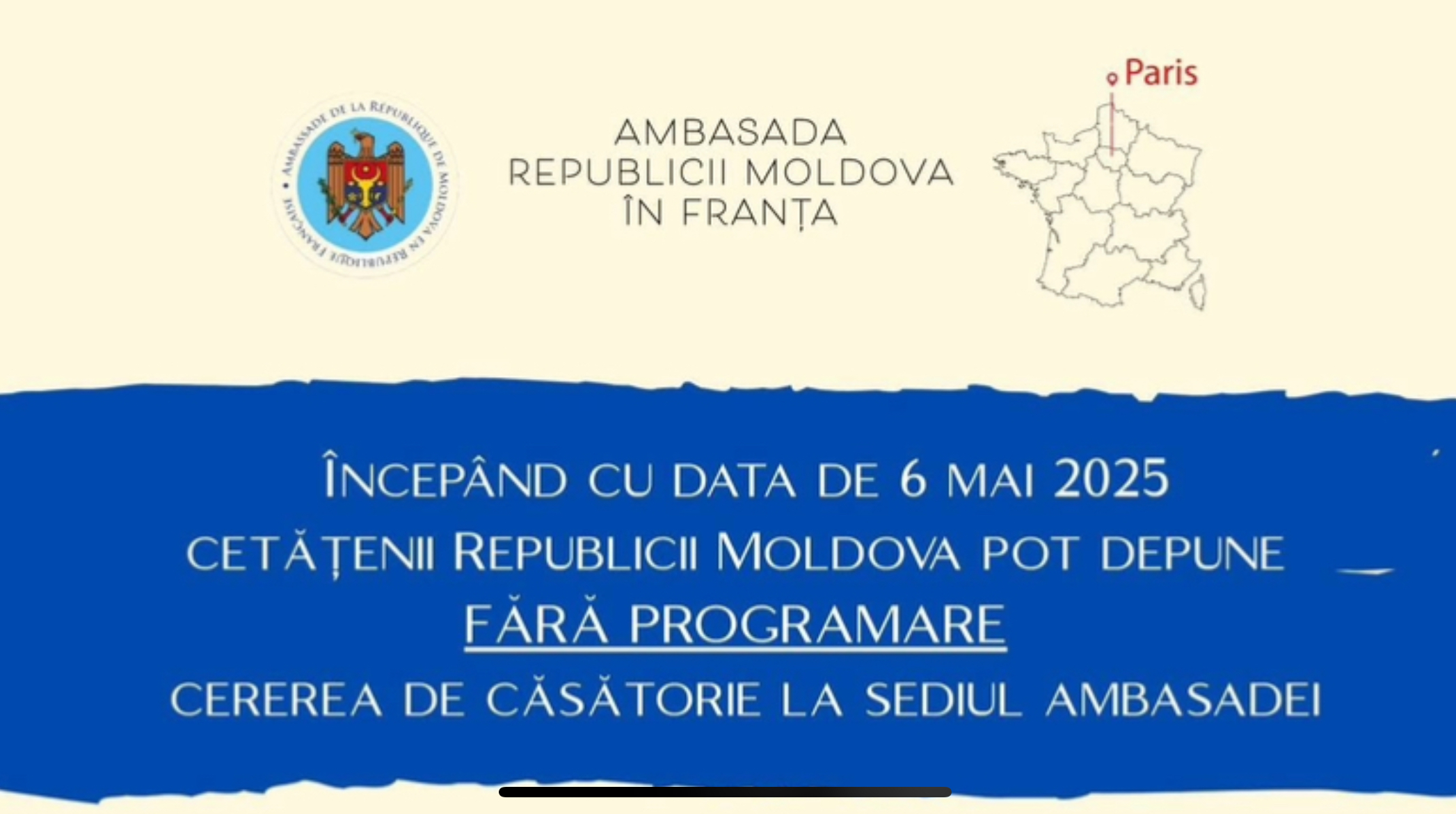 Ambasada Republicii Moldova în Franța anunță că, începând cu data de 6 mai 2025, cetățenii moldoveni pot depune cererea de căsătorie fără programare prealabilă, direct la sediul misiunii diplomatice de la Paris.