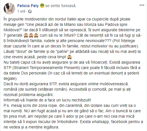 „În grupurile moldovenilor din nordul Italiei apar ca ciupercile după ploaie mesaje gen „cine pleacă azi de la Milano sau Monza sau Padova spre Moldova? Nu bateți capul că nu aveți asigurare și de aia vă întoarceți. Există asigurarea STP (Stranieri Temporaneamente Presenti) care poate fi făcută inclusiv fără a da datele Dvs personale (în caz că vă temeți de un eventual denunț a șederii ilegale). Dacă nu doriți asigurarea STP, exista asigurare online moldovenească, română (de sunteți cetățean român). Accesibilă și comodă, pe mail și ați rezolvat problema asigurării.” scrie moldoveanca.