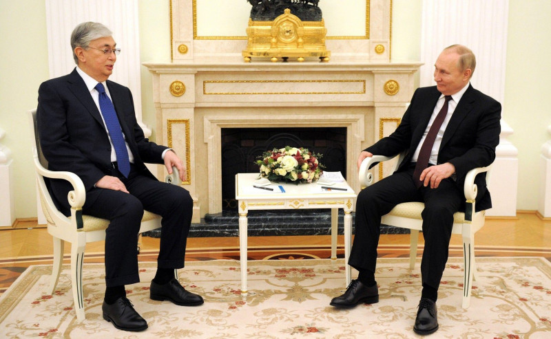 La trei zile după întâlnirea cu Macron, Putin l-a primit pe președintele kazah Kasîm-Jomart Tokaev. Cei doi lideri au dat mâna și au stat aproape unul de celălalt, despărțiți doar de o măsuță de cafea.