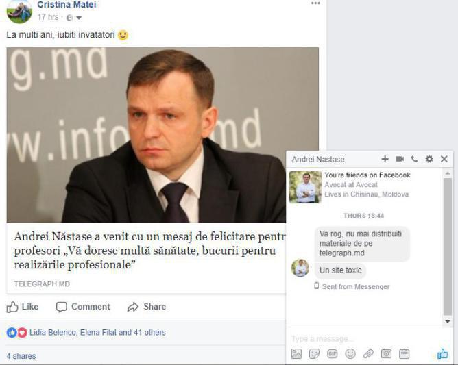 La televizor sau la întâlnire cu cetățenii, politicienii spun de fiecare dată că tot timpul lor îl dedică țării. Este cazul și președintelui Platformei DA, Andrei Năstase. Dumnealui, mai mult ca oricine vrea să convingă că nu are timp nici chiar pentru propia familie, deoarece este preocupat de problemele țării. Surpriză însă, Andrei Năstase trimite mesaje în privat tuturor utilizatorilor de facebook ce distribuie știri de pe portalul nostru, știri pozitive, apropo!
