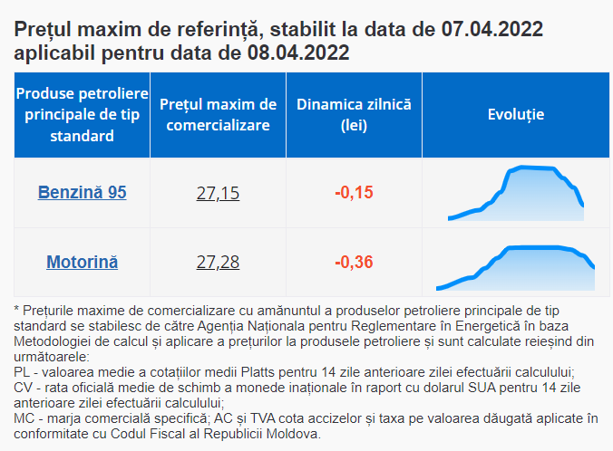 De menționat că, de la 1 septembrie 2021 au intrat în vigoare modificările la legea produselor petroliere, iar ANRE stabilește prețurile plafon pentru benzina cu cifra octanică 95 și pentru motorină.