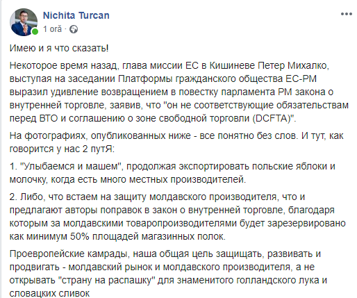 „Camarazi proeuropeni, scopul nostru comun este să apărăm, dezvoltăm și promovăm piața moldavă și producătorul autohton, dar nu, să deschidem țara „în vânt” pentru ceapa olandeză sau prunele slovene.”, încheie consilierul municipal.