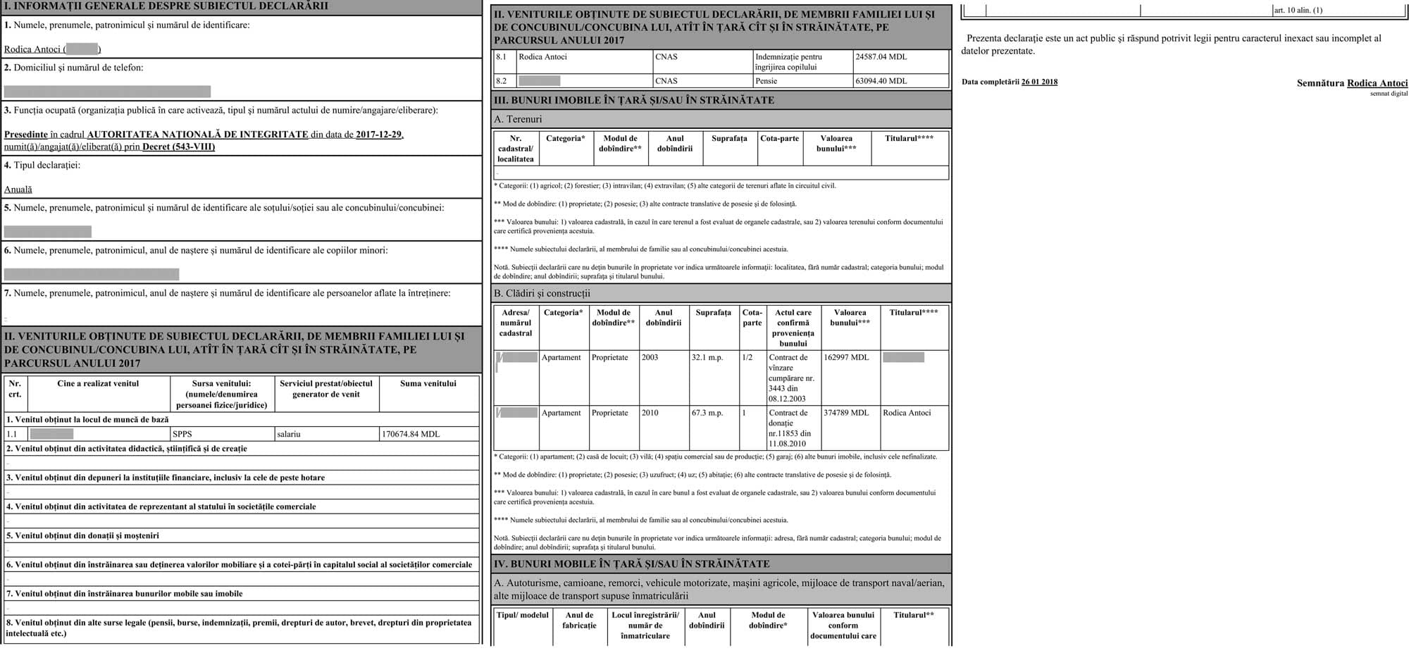 Un an mai târziu, în declarația de avere din 2017, Rodica menționează același apartament din 2010, dar mai adaugă un alt apartament al familiei Antoci pe care îl dețin în proprietate din 2003, cu o suprafață de 32,1 metri pătrați, în valoare de 162 997 lei, dar și pe care șefa ANI nu l-a trecut în declarația de avere din 2016.