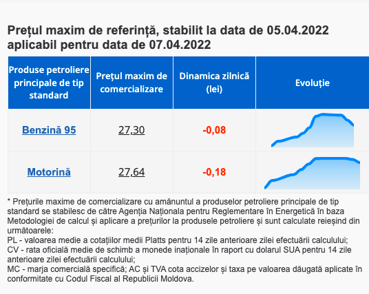 Astfel, prețul pentru un litru de benzină A95 nu trebuie să depășească 27,30 lei, iar cel pentru motorină – 27,64 lei.