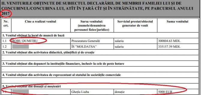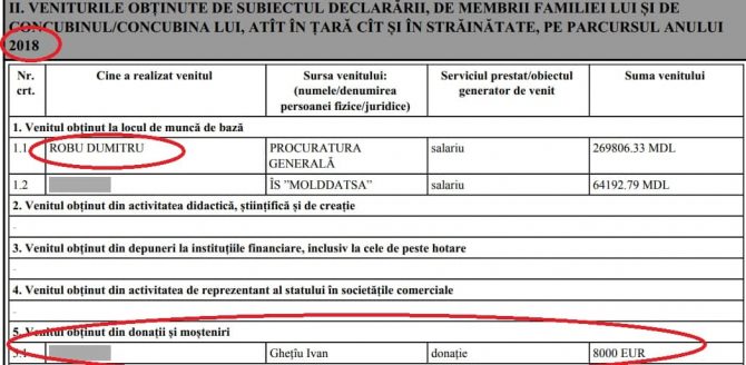 Astfel, în declarația de avere pentru anul 2016, Dumitru Robu a indicat că a primit o donație de 8000 de euro. În 2017, procurorul a mai primit un ajutor de la rude de 5000 de euro. Peste un an, în 2018, Dumitru Robu declară că a primit încă 8000 de euro.