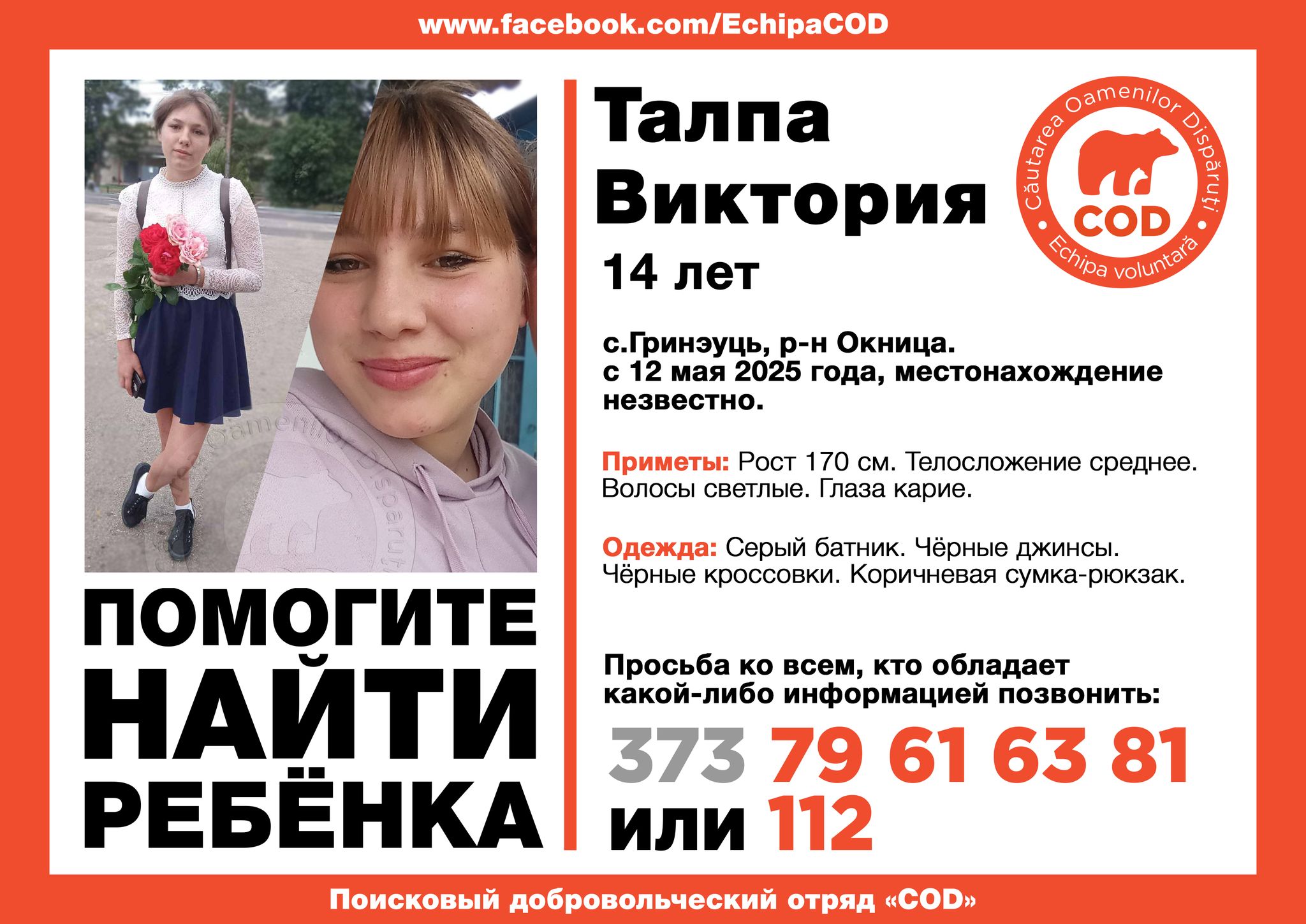 Talpă Victoria, o adolescentă de 14 ani din satul Grinăuți, raionul Ocnița, a dispărut pe 12 mai 2025, iar de atunci nu se mai cunoaște locul aflării sale, anunță echipa COD, care solicită sprijinul populației pentru găsirea minorei.
