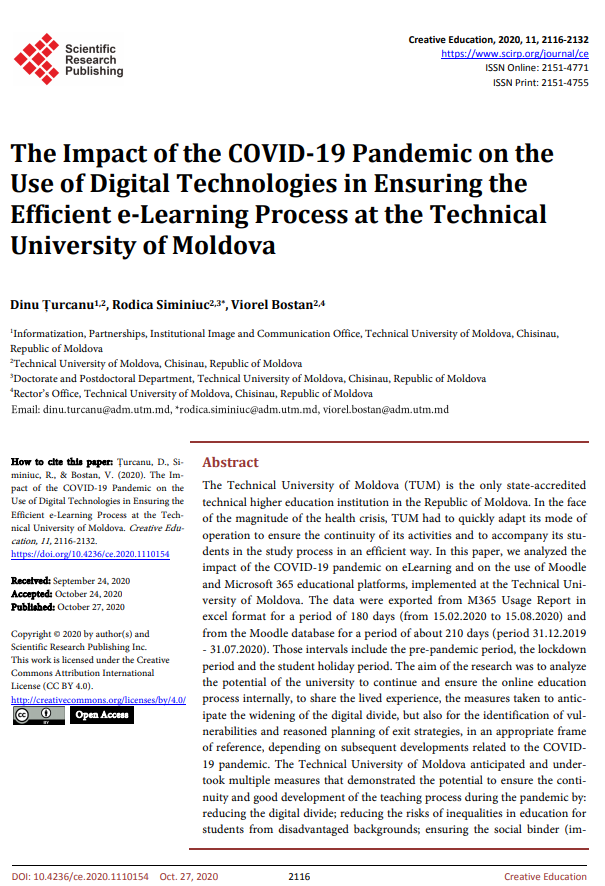 Echipa formată din Viorel BOSTAN, rector, Dinu ŢURCANU, prorector, şi Rodica SIMINIUC, şef Direcție Doctorat şi Postdoctorat, au realizat lucrarea colectivă: „The impact of the COVID-19 pandemic on the use of digital technologies in ensuring the efficient e-learning process at the Technical University of Moldova”, cu un volum de 17 de pagini, publicată de Scientific Research Publishing (SCIRP) în revista ştiinţifică „CREATIVE EDUCATION”.