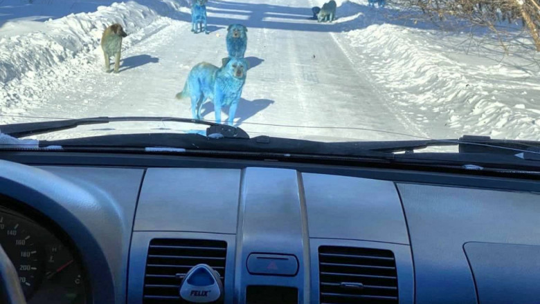 O haită de câini vagabonzi cu blana de un albastru strălucitor a atras atenția utilizatorilor de internet din Rusia.