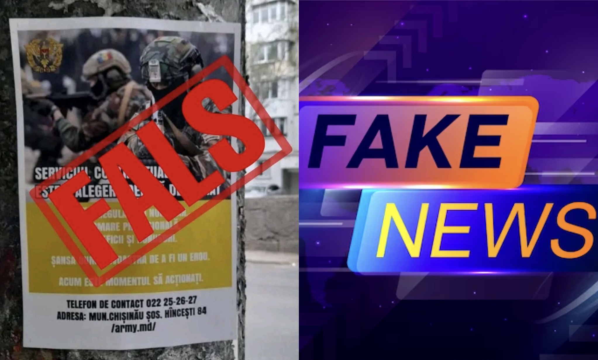 De această dată, falsurile au o altă formă – postere lipite pe clădiri și piloni cu referire la angajarea în serviciul militar pe contract.