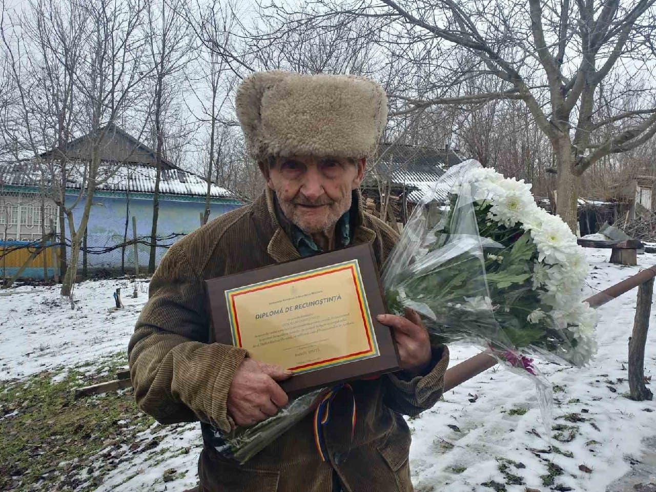 Totodată, din partea Ambasadei României i-au fost oferite veteranului român de război o diplomă de recunoștință, un buchet de flori și un coș cu produse.
