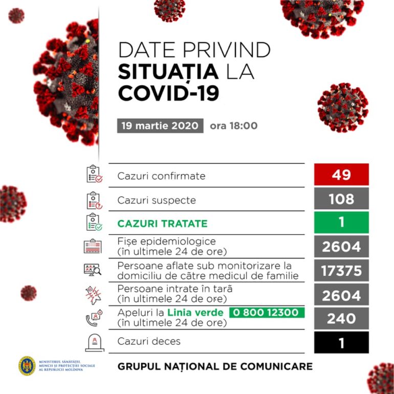 În total, în Republica Moldova sunt 49 de cazuri de infecție cu COVID-19, un caz de deces și un caz de vindecare.