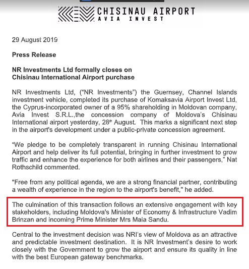 Încheierea acestei tranzacții a venit în urma unui angajament cu părțile cheie interesate, inclusiv ministrul economiei și infrastructurii Moldovei, Vadim Brinzan și prim-ministra Maia Sandu. Un acord de achiziționare a cotei de 95% din compania concesionară a Aeroportului Internațional Chișinău a fost ratificat între reprezentanții Avia Invest și beneficiarul exclusiv al NR Investments, Nat Rothschild, la 19 august.