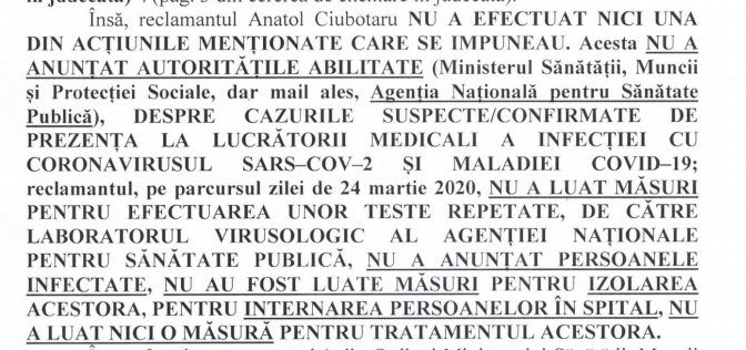 „Reclamantul A. Ciubotaru prin inacțiunile sale a expus unui risc real lucrătorii medicali menționați, a creat în mod neîntemeiat un focar de infecție în cadrul instituției vizate, precum și a pus sub risc activitatea de acordare a asistenței medicale de către instituția medico-sanitară publică SCR, în mod special a activității medicale de combatere a infecției coronavirus”, se arată în referința juristului Șveț.