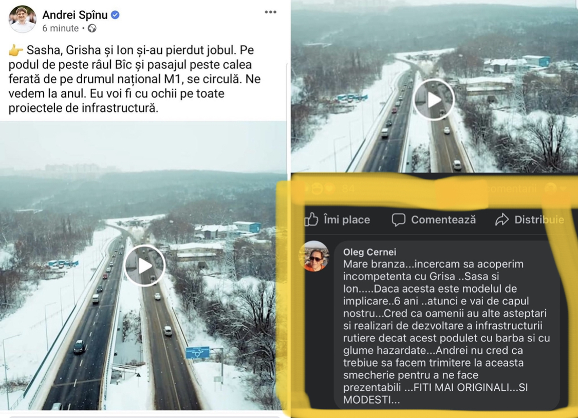 Consilierul raional PAS din Sângerei, Oleg Cernei, prieten cu premierul Natalia Gavrilița, critică postarea ministrului Infrastructurii și Dezvoltării Regionale, Andrei Spînu, despre podul de peste râul Bîc de pe drumul național M1,care s-a construit timp de câțiva ani și a fost inaugurat recent.